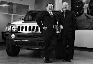 2009年10月8日,在美國密歇根州紹斯菲爾德,悍馬公司首席執(zhí)行官金泰勒(右)和四川騰中重工機(jī)械有限公司總經(jīng)理?xiàng)钜阍谝惠v悍馬汽車前合影。