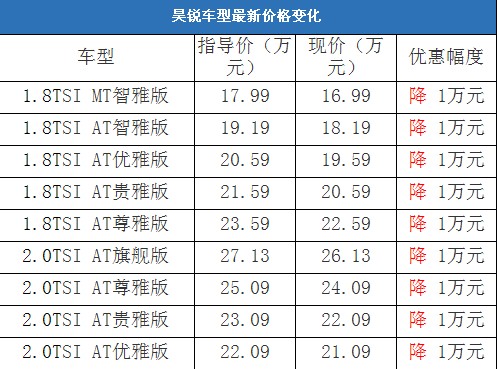 近日,編輯從北京地區(qū)上海大眾斯柯達4S經(jīng)銷商處了解到,昊銳有少量現(xiàn)車(紅色、灰色和黑色);目前購車可以優(yōu)惠1萬元,經(jīng)銷商透露消費者到店詳談還會有更多優(yōu)惠。以下是昊銳最新價格變化表: