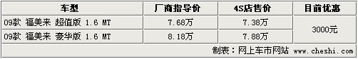據(jù)4S店銷售人員介紹:09款福美來目前最高優(yōu)惠3000元,在北京地區(qū)銷售車型僅有兩款,分別為手動超值版及手動豪華版,售價分別為7.68萬及8.18萬,優(yōu)惠后價格僅為7.38萬。車款顏色方面,共有白色、銀色、黑色等暢銷顏色車型,如需預(yù)定需等半個月左右。