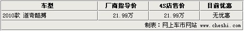 據(jù)4S店銷售人員介紹:目前2010款道奇酷搏北京地區(qū)無(wú)現(xiàn)車,但部分4S店內(nèi)接受預(yù)訂,定金為5000元。據(jù)經(jīng)銷商介紹,2010款酷搏計(jì)劃將在第二季度引入中國(guó),但最早可能在3月份到店銷售。2010款酷搏仍將搭載2.0升自然吸氣發(fā)動(dòng)機(jī),在配置上將與08款車型相差不多,相比09款車型配置更豐富;此款車型售價(jià)為21.99萬(wàn)元,在價(jià)格方面與老款車型持平。