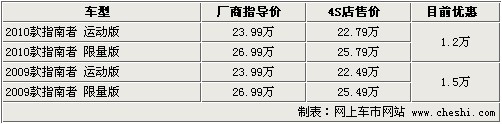 據(jù)4S店銷(xiāo)售人員介紹:指南者目前共有2009款及2010款車(chē)型,分別為運(yùn)動(dòng)版及限量版總共4款。09款車(chē)型現(xiàn)車(chē)顏色為黑色及綠色,全系優(yōu)惠1.5萬(wàn)元;2010款車(chē)型有黑色、綠色、紅色,最高優(yōu)惠1.2萬(wàn)元。目前老款及新款優(yōu)惠價(jià)格相對(duì)較高,如果到店洽談會(huì)有簡(jiǎn)單裝飾贈(zèng)送。09款指南者優(yōu)惠后最低僅售22.49萬(wàn)元,凸顯性?xún)r(jià)比。