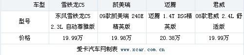 本次選取了4款車(chē)中售價(jià)約為20萬(wàn)的4個(gè)車(chē)型進(jìn)行橫向數(shù)據(jù)對(duì)比。通過(guò)對(duì)車(chē)身尺寸,動(dòng)力配置,安全性及舒適性配置的數(shù)據(jù)對(duì)比為您選購(gòu)愛(ài)車(chē)進(jìn)行比較。因?yàn)榇舜挝覀冞x擇的是價(jià)格區(qū)間非常接近的4款車(chē)型,沒(méi)有考慮排量和高低配的因素,所以在各項(xiàng)配置方面各車(chē)型之間存在一定差距。