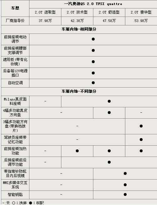 在內(nèi)部配置上,奧迪Q5前排的駕駛員以及副駕駛提供了帶有腰部支撐功能的電動可調(diào)節(jié)座椅,除了進(jìn)取型外,其他3款前排座椅均帶有加熱功能,且豪華版車型的前排座椅還配有電動記憶功能。入門級的進(jìn)取型采用的是Havanna織物面料座椅,而其他3款車型均采用了Milano真皮包裹的座椅。進(jìn)取型以及技術(shù)型采用了4輻真皮方向盤,舒適型的4輻方向盤帶有多功能鍵,為了增添駕駛樂趣,豪華版車型在3輻多功能真皮方向盤的后方配有換擋撥片。值得一提的是,技術(shù)型、舒適型以及豪華型的后排座椅可以前后調(diào)節(jié)100mm,為體型稍胖的乘客提供了更大的腿部空間。
