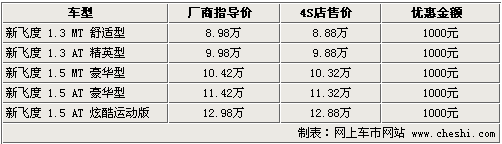 時(shí)尚精致的外觀,精細(xì)的內(nèi)飾做工,省油是飛度這款日系小車持續(xù)熱銷的原因。3月1日起,廣汽本田調(diào)整了飛度4款車型的售價(jià),重新調(diào)整后的售價(jià)比原來(lái)的廠商指導(dǎo)價(jià)上漲了400元——3000元。目前消費(fèi)者購(gòu)車優(yōu)惠幅度在1000元左右,具體車型見下表: