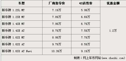 據(jù)北京雪佛蘭4S店銷售人員介紹,目前購買新樂騁的消費者可以得到1.2萬元的優(yōu)惠。新樂騁分為1.2L、1.4L以及1.6L三個排量車型,經(jīng)1.2萬元優(yōu)惠后,入門級的1.2L手動擋車型的售價從7.19萬元下降到了5.99萬元,不足6萬元。新樂騁1.6L自動檔車型經(jīng)1.2萬元優(yōu)惠后,最高配的1.6L自動導航版售價降到了9.19萬元,不足10萬元。銷售人員還介紹,店內(nèi)目前只有1.4L車型自動檔有現(xiàn)車,其他車型需消費者交1千元訂金,約等三周后可提車。