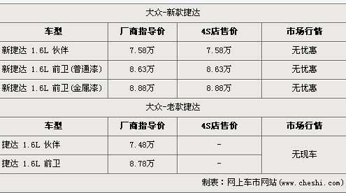 據(jù)北京一汽大眾經(jīng)銷店銷售人員介紹,大眾全新捷達1.6L分為伙伴版以及前衛(wèi)版兩種車型,售價分別為7.58萬元和8.88萬元,由于前衛(wèi)版白色車型采用的是普通漆油料,所以在廠商指導價方面會比前衛(wèi)版其他顏色車型便宜2500元,售價為8.63萬元。銷售人員還介紹,老款的大眾捷達已經(jīng)沒有現(xiàn)車,消費者已經(jīng)無法購買到。