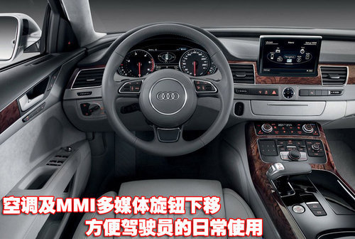 奧迪新A8配備了大尺寸液晶屏幕,并且采用隱藏式伸縮設(shè)計(jì)。除通過座椅上的按鈕調(diào)節(jié)座椅外,還可以通過液晶屏幕上的相關(guān)圖示進(jìn)行坐姿選擇。除此之外,中控臺上的復(fù)古式指針石英表也凸顯了奧迪新A8的華貴。