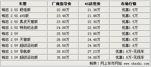 豐田銳志作為一款以運動著稱的后驅中級車,在性能以及操控各方面表現(xiàn)都令人滿意,尤其是獨具個性的改裝潛力,讓很多癡迷運動的車迷們找到了充分的駕 駛樂趣。銳志配備有2.5L和3.0L兩種排量的發(fā)動機,同時超長的軸距設計讓乘員的空間也有了非常理想的狀態(tài)。近日根據網上車市價格監(jiān)測系統(tǒng)顯示,目前 購買銳志車型,最高可享受到1.8萬元的現(xiàn)金優(yōu)惠。具體車型見下表: