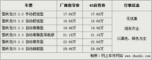 東風雪鐵龍C5秉承了雪鐵龍先進的創(chuàng)新理念和完美的制造工藝,從外觀到內(nèi)飾的做工充分體現(xiàn)了這款中級車的內(nèi)在價值。同時一系列高端配置以及車身安全性方面均有不俗的表現(xiàn)。根據(jù)網(wǎng)上車市價格監(jiān)測系統(tǒng)顯示,目前C5全系都有現(xiàn)車供應,車價方面無任何優(yōu)惠。