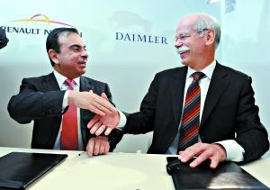 2010年4月7日,比利時(shí)布魯塞爾,當(dāng)戴姆勒集團(tuán)董事會(huì)主席迪特·蔡澈與雷諾-日產(chǎn)聯(lián)盟主席卡洛斯·戈恩同時(shí)在一份看起來(lái)非常簡(jiǎn)樸的文件上簽字之后,世界汽車(chē)工業(yè)的格局再次發(fā)生了重大改變,戴姆勒-雷諾-日產(chǎn)新組成的聯(lián)盟,一躍成為排在豐田和大眾-鈴木聯(lián)盟之后的世界第三大汽車(chē)聯(lián)盟。