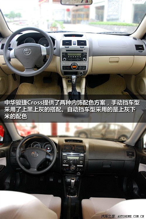 與個性的外觀相比,駿捷Cross在內(nèi)飾上似乎并沒有體現(xiàn)出什么特點,呈現(xiàn)的一派典型的轎車化風(fēng)格,做工在自主品牌里面算是比較出色的,而且樣式也絕對不亞于同價位的合資車型,其中手動擋車型采用的是上黑下灰的配色方案,而自動擋車型則為更接近結(jié)局的上灰下米的色彩搭配。