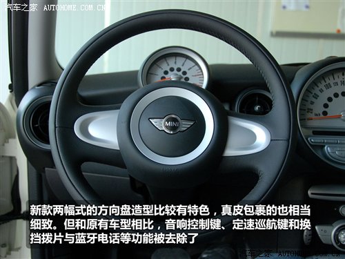 此外,兩輻式的方向盤造型改變對于熟悉MINI的人來說就需要時間去適應(yīng)了,造型的改變和價格沒什么直接的關(guān)系,關(guān)鍵在于多功能按鍵也隨之消失了,原來的音響調(diào)節(jié)、定速巡航和車載電話功能都不再能看到?吹竭@里你可別不高興,要知道這些都有裝備的車型就不是這個價了,要30萬以上才行。