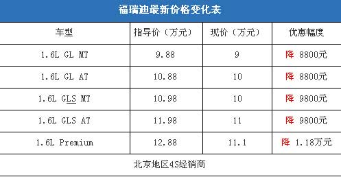 近日,編輯從北京地區(qū)東風(fēng)悅達(dá)起亞4S經(jīng)銷商處了解到,福瑞迪1.6L車型的現(xiàn)車充足,目前購車最高可以優(yōu)惠1.1萬元,性價(jià)比很不錯(cuò)。據(jù)經(jīng)銷商透露,消費(fèi)者要想以這個(gè)價(jià)格提車,需要在店內(nèi)做購車一條龍服務(wù),車輛商業(yè)險(xiǎn)可以打9折。