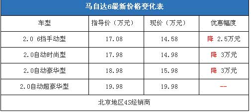 近日,編輯從北京地區(qū)方正利成一汽馬自達(dá)4S經(jīng)銷商處了解到,馬自達(dá)6的現(xiàn)車充足,優(yōu)惠幅度非?捎^,手動(dòng)擋車型降價(jià)2.5萬元,而自動(dòng)擋車型最高可以降價(jià)3萬元。據(jù)經(jīng)銷商透露,選擇分期付款,那么消費(fèi)者首付不足8萬元就可以把曾經(jīng)的“神車”開回家。