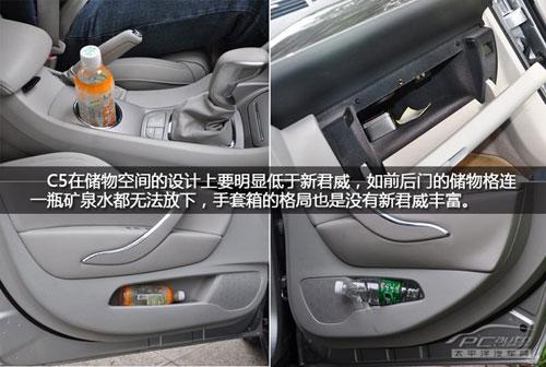 車內儲物空間我們用的是“飲料瓶”來衡量看看究竟那款車更人性,新君威車內的儲物空間設計相當人性化,前后側門的儲物格能放進去飲料瓶,手套箱的儲物格局也是很豐富,排擋前方預留了2個飲料瓶的儲物槽,但是中控臺上方對于票據(jù)、錢包、手機等雜物空間設計就沒有C5那么人性。
