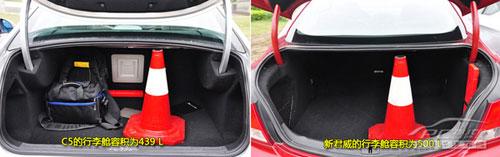 儲物空間對比還是用實物衡量比較直觀,接下來我們在兩輛車行李箱裝入了一樣的物品“雪花桶”,新君威的500L行李箱容積所帶來的優(yōu)勢從圖片上就能看出,而學鐵龍C5的439L的行李箱要明顯劣勢新君威。