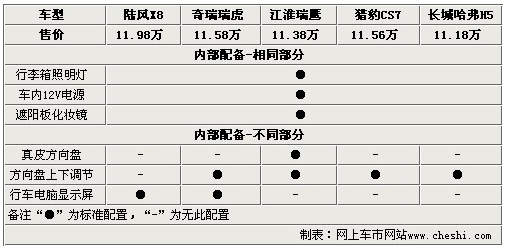 既然是一款SUV,我們就不能以評價轎車的標(biāo)準(zhǔn)來衡量它,畢竟造車的出發(fā)點(diǎn)是不同的。SUV車型更看重內(nèi)部載人載物的能力、駕駛安全性等能力。一些時尚新鮮的內(nèi)部配置我們還是留著在轎車上體驗(yàn)吧。三款車的內(nèi)部都配備了行李箱照明燈、12V電源和遮陽板化妝鏡。但是在5款車中,僅有瑞鷹為使用者提供了更顯檔次的真皮方向盤。