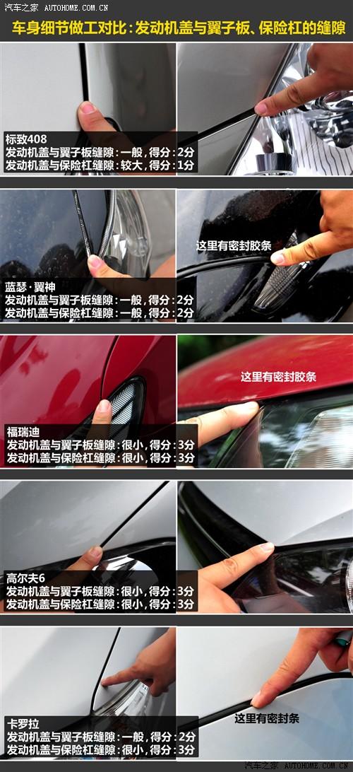 在這一環(huán)節(jié)的對(duì)比中,得分最高的高爾夫占了很大的便宜,其實(shí)是因?yàn)樗捎昧思す夂附拥能図敚龊跷覀円饬系牟皇歉郀柗颍歉H鸬,他的鈑金縫隙控制非常好,發(fā)動(dòng)機(jī)蓋與翼子板和保險(xiǎn)杠的接縫都非常小,在10款車中都是最小級(jí)別的。