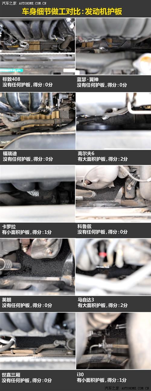 在發(fā)動機護板這方面,高爾夫6和進口馬自達兩廂有大面積的發(fā)動機護板,能夠起到一定的保護作用,i30和卡羅拉有小面積的護板,而其他6款車型則沒有任何護板。