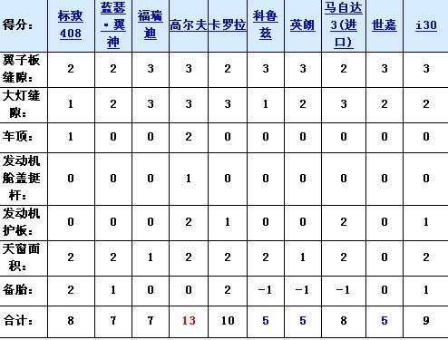 不難看出,標(biāo)致408雖然夠大,但他的做工和細(xì)節(jié)并不像看上去那么精細(xì),在10款緊湊型車中僅僅處于中等水平;藍(lán)瑟·翼神各方面中規(guī)中矩,沒有突出的亮點(diǎn);福瑞迪的外觀縫隙控制最出色,但天窗面積和備胎令人不爽;身材最小的高爾夫6因?yàn)榫哂芯?xì)的外部做工,大面積的天窗和發(fā)動(dòng)機(jī)護(hù)板而在外觀方面有一定的優(yōu)勢(shì),同時(shí)他的外觀也是十分招人待見的,只不過不停的減配令人很不爽;卡羅拉中庸但沒有明顯的短板,所以得分也不低;來自于通用集團(tuán)的科魯茲和英朗存在同樣的問題:大燈縫隙有點(diǎn)大,小備胎令人很很懊惱;進(jìn)口馬自達(dá)3如果不是因?yàn)樾涮サ脑挘敲闯煽円膊诲e(cuò);世嘉除了縫隙控制得還可以以外,其他方面沒有任何亮點(diǎn);i30的表現(xiàn)卻比想象中強(qiáng)大,各方面均衡,成績僅次于卡羅拉。