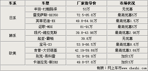 在眾多SUV車型的的范圍中,我們精選了10款各種具有獨(dú)特代表性的車型作為對(duì)象,其中囊括的日系、韓系和歐美車型,這樣更具有市場(chǎng)針對(duì)性,車型的價(jià)格范圍也從40萬波及至80萬元。整體呈現(xiàn)出事態(tài)強(qiáng)烈的各種狀態(tài),優(yōu)惠幅度最大的是寶馬X3車型,最高優(yōu)惠8.6萬;而在天平的另一端,加價(jià)最高的是別克昂科雷和卡迪拉克新SRX,加價(jià)額度均為3萬元。當(dāng)然也有不加價(jià)的車型分別是豐田FJ酷路澤和起亞霸銳。