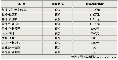 我們選取了目前市場(chǎng)上熱銷的大眾朗逸、福特福克斯等10款車型。經(jīng)過(guò)我們?cè)诒本┦袌?chǎng)的調(diào)查后發(fā)現(xiàn),這些車型目前的庫(kù)存量較上個(gè)月均有所上升,大部分車型的價(jià)格開始出現(xiàn)松動(dòng),最高降幅達(dá)5萬(wàn)元。而也有部分新上市不久的車型價(jià)格仍然堅(jiān)挺,但是現(xiàn)車明顯增多。