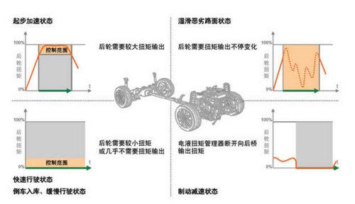只要仔細看看廠商網(wǎng)站上四驅(qū)系統(tǒng)的扭矩輸出圖就不難看出了:在大多數(shù)高速行駛,或是倒車入庫、緩慢行駛的時候,途觀為了油耗考慮,后輪扭矩分配為零,就是作為一款前驅(qū)車而存在的,只有當起步加速時,或是前輪打滑需要后輪驅(qū)動脫困時,才會分配扭矩給后輪,以獲得更好的加速性能或是道路通過性。這明明就是一套適時四驅(qū)結(jié)構(gòu),卻要扯上虎皮裝成“智能全時”!