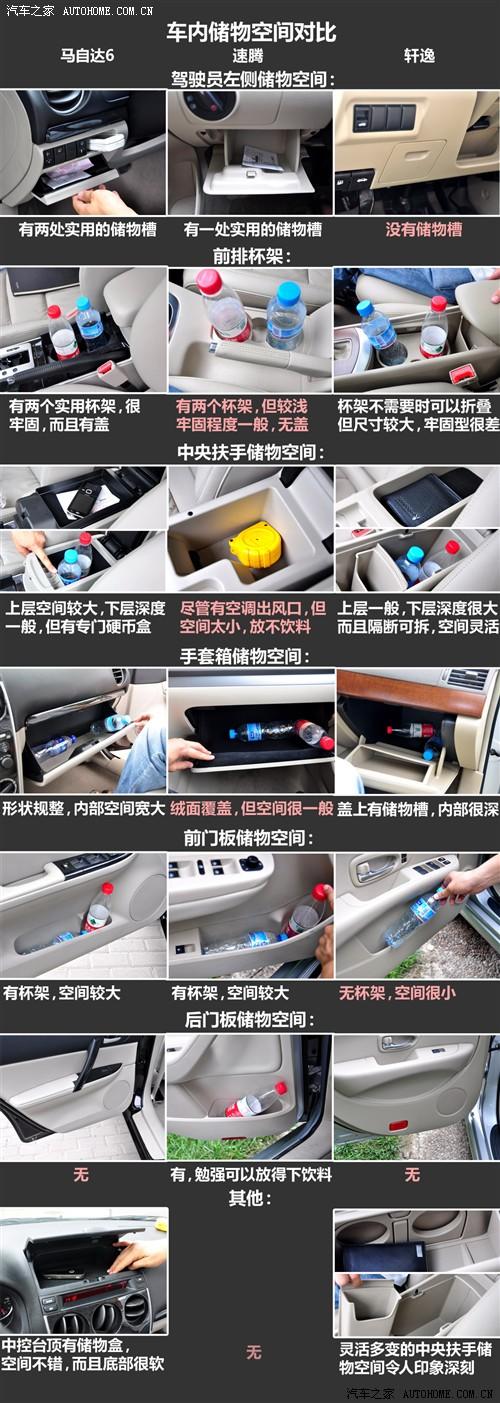 在這方面,速騰僅有的優(yōu)勢在于后門板上有儲(chǔ)物槽,而且能放得下飲料瓶,其他方面因?yàn)槌叽缱钚∷砸矝]什么亮點(diǎn),特別是前排中央扶手內(nèi)的空間太小,幾乎沒什么使用價(jià)值;馬自達(dá)6的表現(xiàn)中規(guī)中矩,沒有花哨的設(shè)計(jì),但也不乏亮點(diǎn),比如中控臺頂部的儲(chǔ)物槽;軒逸的亮點(diǎn)是靈活而且寬大的前排儲(chǔ)物空間,以及非常深的副駕駛手套箱。