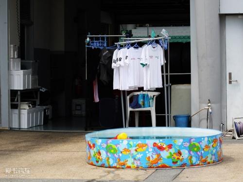 走進(jìn)賽車場(chǎng)后,我們發(fā)現(xiàn)每個(gè)pit房后面都有一個(gè)兒童游泳池↑