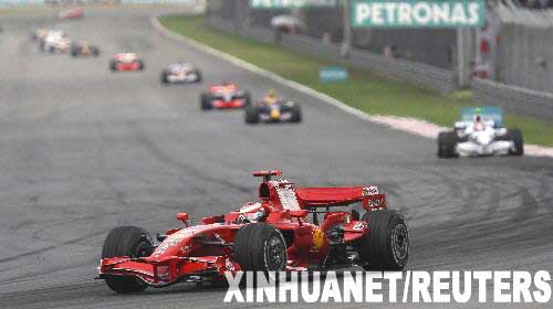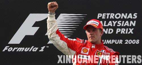 3月23日,法拉利車隊車手萊科寧(前)駕駛賽車角逐。當(dāng)日,在F1大獎賽馬來西亞站的比賽中,萊科寧以1小時31分18秒555的成績奪得冠軍。