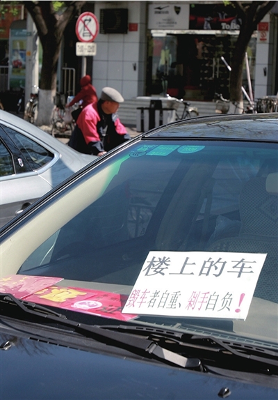 “毀車者自重、剁手自負(fù)!”昨天,東城區(qū)東四北大街43號(hào)一輛掛著警示牌的“牛車”引得路人駐足觀看、拍照。車主金先生說(shuō),放狠話是因?yàn)樗能囋谕\噲?chǎng)多次被劃,希望以此嚇退劃車人。