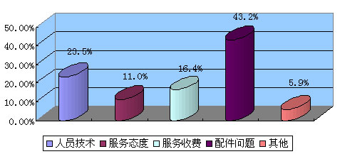 報告顯示,在汽車產(chǎn)品服務(wù)質(zhì)量的投訴中,對配件問題、服務(wù)態(tài)度的投訴較上一季度有所增加,對人員技術(shù)、服務(wù)收費的投訴有所下降。其中,久修不好是引發(fā)消費者投訴廠家服務(wù)質(zhì)量的最主要原因。具體構(gòu)成比例:人員技術(shù)占23.5%,服務(wù)態(tài)度占11.0%,服務(wù)收費占16.4%,配件問題占43.2%,其他占5.9%。