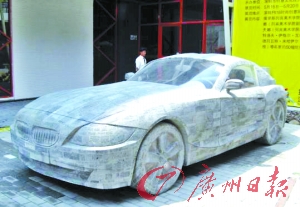 據(jù)介紹,該作品由現(xiàn)代藝術(shù)家戴耘歷時(shí)一年多創(chuàng)作完成。記者發(fā)現(xiàn),其輪胎、方向盤(pán)、排氣管,甚至連車標(biāo)都是用磚頭精心打磨而成。該創(chuàng)意園的工作人員介紹,這部車除了不能開(kāi)之外,外形酷似寶馬車,價(jià)值達(dá)70多萬(wàn)元,其價(jià)位也堪比真寶馬。(鮑文娟)