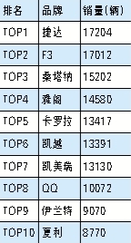 與上月相比,桑塔納和雅閣排名提前,QQ再次進入前十名,表現(xiàn)也較為出色。