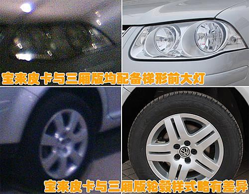 寶來(lái)皮卡與寶來(lái)經(jīng)典版車型同樣配備了梯形一體式前大燈,但在輪轂樣式方面兩款車略有不同。寶來(lái)皮卡沒(méi)有配備寶來(lái)經(jīng)典版車型的5輻中控鋁合金輪轂,而是配備了7輻式新款合金輪轂。