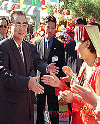 全國人大常委會(huì)委員長李鵬(左)十月二日在中山公園參加國慶五十周年游園活動(dòng) 時(shí),與少數(shù)民族代表親切握手。