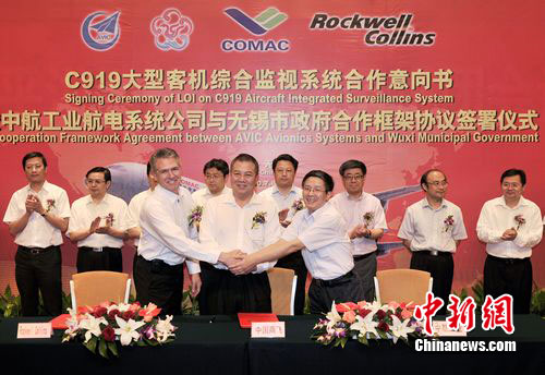 中新網(wǎng)無錫7月8日電(記者 孫權(quán))中國商用飛機(jī)有限責(zé)任公司、中航工業(yè)雷達(dá)與電子設(shè)備研究院和美國羅克韋爾柯林斯公司三方今日在無錫“握手”,確定國產(chǎn)C919大型客機(jī)綜合監(jiān)視系統(tǒng)的研制生產(chǎn)項(xiàng)目落戶無錫市濱湖區(qū)。幾年后,裝備“無錫造”綜合監(jiān)視系統(tǒng)的C919大型客機(jī),將翱翔在中國的藍(lán)天,并飛行在世界各地。