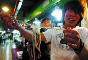 記者昨日來到京深海鮮市場,發(fā)現(xiàn)很多攤位都出售章魚,活章魚價格每斤30元左右,死章魚每斤15元左右。據(jù)一家攤主介紹,自從世界杯捧火了章魚保羅后,最近總有客人來詢問是否有章魚賣。原來市場里僅有兩三家賣章魚的,而世界杯后,不少攤位都增加了章魚生意。