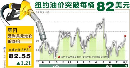 由于利好經(jīng)濟(jì)數(shù)據(jù)和強(qiáng)勁歐洲銀行業(yè)績提振了投資者信心,8月2日紐約商品交易所油價大幅攀升,突破每桶80美元關(guān)口,收于每桶81.34美元,為近三個月以來的最高水平。8月3日,延續(xù)漲勢,紐交所油價收于每桶82.55美元。8月4日,小幅下跌,紐交所9月份交貨的輕質(zhì)原油期貨價格跌8美分,至每桶82.47美元。