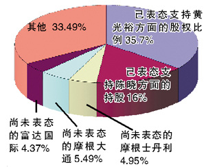 從公開表態(tài)的情況來看,黃光裕陣營除了自己的32.47%股權(quán)外,還有黃光裕好友鄭建明2%、表明“挺黃”的內(nèi)地股民歐陽雪初方面0.6%的股權(quán)支持,合計持股大概是35.7%。