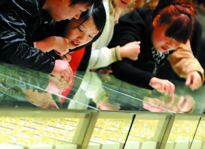 截至昨天收盤,上海期貨交易所的黃金期貨主力合約上漲0.47%,收于293.34元/克,再創(chuàng)新高。菜百銷售收藏金條的售貨員告訴記者,賣場10月8日調(diào)的價,但從現(xiàn)在的形勢看,應該還會漲。由于收藏金條和黃金飾品的價格并非每日隨行情調(diào)整,經(jīng)過9月25日和10月8日的兩次調(diào)價后,市民對于收藏金條調(diào)價的預期強烈。工美大廈的一位銷售人員表示,近期黃金銷售至少比同期增長50%。