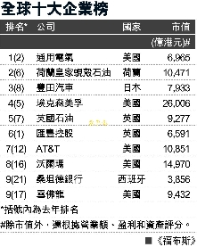 據(jù)香港《文匯報》消息,《福布斯》根據(jù)綜合評分定出是項排名,營業(yè)額、盈利、資產(chǎn)和市值占同等比重。三甲位置分別由美國通用電氣、荷蘭皇家蜆殼石油和日本豐田汽車奪得,十大位置中,美國占了5席。