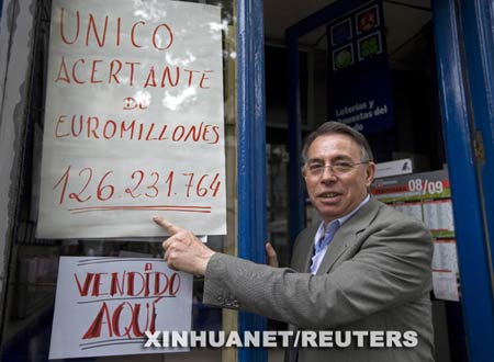 位于西班牙首都馬德里自由女神廣場的“黑貓”彩票銷售店的櫥窗上,貼著一張標(biāo)示,告訴路人“歐洲百萬”頭獎在這兒售出。