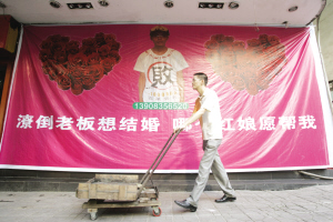 “潦倒老板想結(jié)婚,哪個(gè)紅娘愿幫我!弊蛉丈衔,一塊印有征婚內(nèi)容的彩色巨大噴繪橫幅驚現(xiàn)渝北區(qū)兩路一處串串香門(mén)面外,橫幅上印有征婚者肖像及聯(lián)系方式,仔細(xì)一看,征婚者身上竟然標(biāo)注為“百萬(wàn)負(fù)翁”。上前打探得知,原來(lái)征婚者就是這家串串香店的老板,由于4年前做生意虧損,欠下上百萬(wàn)債務(wù),如今他想通過(guò)征婚找到另一半與自己共渡難關(guān)。