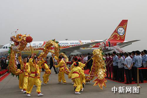 中新網(wǎng)成都6月23日電(楊杰 陳典路)23日下午17點09分,國內(nèi)總裝的第一架空客A320飛機、“中華龍”號調(diào)機航班抵達(dá)成都雙流機場,飛機緩緩滑向停機位,兩輛噴水車為飛機“噴水洗塵”;機坪上鑼鼓聲聲,獅舞龍騰。至此,國內(nèi)總裝的第一架空客A320飛機正式落戶四川航空。