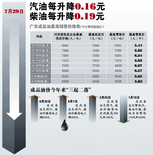 隨后,省物價(jià)局根據(jù)國(guó)家規(guī)定,也制定公布了廣東省的成品油銷售價(jià)格。這也是全省成品油價(jià)格繼6月份一個(gè)月內(nèi)連續(xù)2次上漲之后,首次出現(xiàn)下調(diào)。降價(jià)的幅度從0.16元/升~0.20元/升不等,其中國(guó)Ⅲ標(biāo)準(zhǔn)97號(hào)汽油降價(jià)最多,降價(jià)后每升最高零售價(jià)為6.57元。