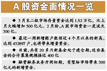 由上海證券報(bào)和申銀萬國研究所聯(lián)合推出的股市月度資金報(bào)告顯示,今年3月末,A股市場的存量資金在經(jīng)歷了近3個(gè)月的盤底振蕩后開始上升,當(dāng)月末二級(jí)市場存量資金達(dá)到1.52萬億,比上月大幅增加500億元。這個(gè)跡象,使得二月份一度明顯流失的市場資金面再度回穩(wěn),此前的2月份,A股市場資金一度流失300億。