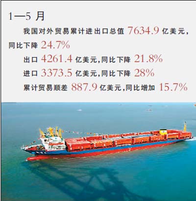 在內(nèi)需呈現(xiàn)升溫態(tài)勢的同時,外需仍然持續(xù)萎縮。據(jù)海關(guān)統(tǒng)計,5月份當月,我國進出口總值1641.3億美元,同比下降25.9%,降幅比今年前4個月累計同比降幅加深1.5個百分點。其中出口887.6億美元,降幅加深5.9個百分點,進口753.7億美元,降幅收窄3.6個百分點。