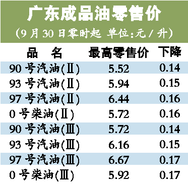 國(guó)家發(fā)改委決定從今天零時(shí)起降低成品油價(jià),汽、柴油每噸降低190元。昨日,廣東省物價(jià)局公布了新的成品油最高銷(xiāo)售價(jià)格。國(guó)Ⅱ標(biāo)準(zhǔn)90號(hào)汽油每升下調(diào)0.14元,93號(hào)汽油每升下調(diào)0.15元,97號(hào)汽油每升下調(diào)0.16元,0號(hào)柴油每升下調(diào)0.16元;國(guó)Ⅲ標(biāo)準(zhǔn)90號(hào)汽油每升下調(diào)0.14元,93號(hào)汽油每升下調(diào)0.15元,97號(hào)汽油每升下調(diào)0.17元,0號(hào)柴油每升下調(diào)0.17元。(記者葉平生 通訊員岳佳綜)