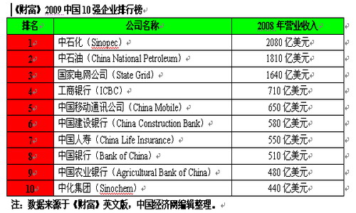 美國《財富》雜志英文版10月13日公布了中國10強公司排行榜,中石化以2080億美元銷售收入(2008年數據)名列第一位,中石油排名第二,2008年銷售收入為1810億美元。排在第三位的是國家電網公司,2008年營業(yè)收入為1640億美元。